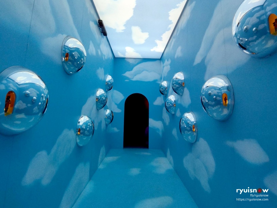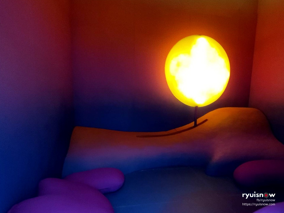 เมื่อเราเดินเข้ามาด้านในจะได้พบกับห้องแรก ในโทนสีเหลือง ซึ่งมีพระอาทิตย์ดวงโตที่ตั้งเด่นอยู่กลางห้อง ที่เปรียบเสมือนช่วงเวลาเช้าให้เราได้สัมผัสกับรุ่งอรุณแห่งวันใหม่ที่สดใส ห้องถัดมาได้แรงบันดาลใจจากช่วงเวลากลางวัน ที่เต็มไปด้วยท้องฟ้าสีสดใส เมื่อมองไปตรงเพดานด้านบน เราจะได้เห็นปุยเมฆสีขาวอีกด้วย